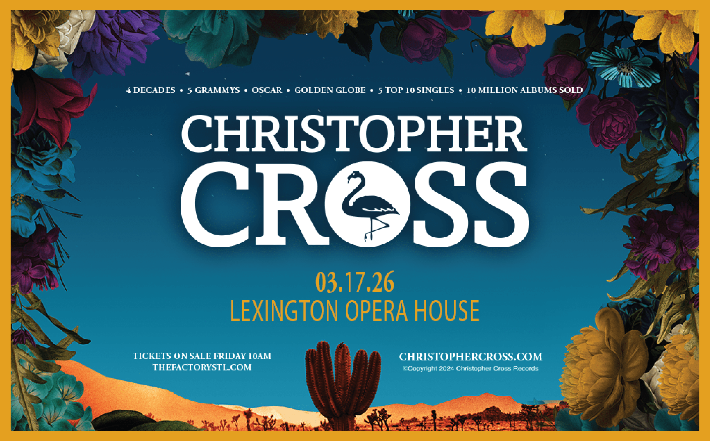 LEXINGTON, KY (November 17, 2025) – The Lexington Opera House is thrilled to announce that Grammy Award-winning singer-songwriter Christopher Cross will take the stage for an unforgettable evening of music and nostalgia on March 17, 2026.